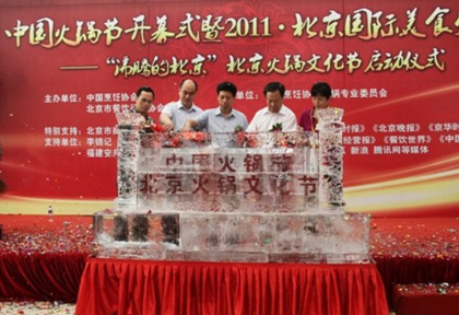 中國(guó)烹飪協(xié)會(huì)副會(huì)長(zhǎng)劉秀軍,中國(guó)烹飪協(xié)會(huì)副會(huì)長(zhǎng)、北京餐飲行業(yè)協(xié)會(huì)會(huì)長(zhǎng)湯慶順,北京市商務(wù)委員副巡視員趙利宗等出席了開(kāi)幕儀式。所謂冰火不容,現(xiàn)場(chǎng)卻以冰雕啟動(dòng)剪彩儀式,火引冰薪、融化了原本屬于夏日的標(biāo)志,火鍋突圍、人們的熱情讓會(huì)場(chǎng)頓時(shí)直達(dá)沸點(diǎn)。