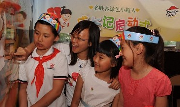 京城首家“必勝客綠色小超人主題餐廳”近日正式揭幕。大學(xué)生志愿者們帶領(lǐng)來自呼家樓小學(xué)的首批“必勝客綠色小超人”在這里開始了一場“畫手絹游戲”!