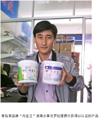 記者隨意走進(jìn)10棟的一家食用化工商行。該商行的進(jìn)門處,放著多箱標(biāo)注產(chǎn)地為青島的“肉寶王”。記者從貨架上拿起一桶正要查看,老板蔡先生循聲從里面走出來,警惕地問:“你是做什么的?”記者表明了身份,表示希望坦誠交流,蔡先生這才放松緊張情緒!澳悴粫缘,這兩天來我店子里暗訪的記者不止一位,所以我一看你走進(jìn)來,就猜你可能也是記者!辈滔壬f。
