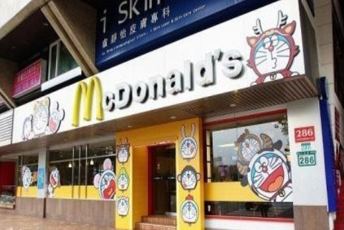 2010年2月,臺(tái)灣的麥當(dāng)勞花巨資打造了全臺(tái)20家麥當(dāng)勞哆啦A夢(mèng)旗艦店。而臺(tái)北的麥當(dāng)勞則首當(dāng)其沖。這些旗艦店以機(jī)器貓(Doraemon) 12生肖版為主題,餐廳內(nèi)每個(gè)角落都可以看到哆啦A夢(mèng)12生肖不同的造型和豐富的表情。從大門(mén)設(shè)計(jì)、窗貼、餐廳內(nèi)柜臺(tái)、門(mén)柱等裝潢,到餐盒包裝設(shè)計(jì)以及員工服飾等,到處都可以感受到機(jī)器貓 (Doraemon) 的存在。