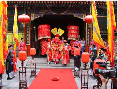 仿膳飯莊的婚宴很有中國傳統(tǒng)氛圍。新娘可以坐著八抬大轎,在眾多吹鼓手吹吹打打的簇?fù)硐拢瑥谋焙9珗@東門進(jìn)入公園,過石橋、穿游廊再回到仿膳飯莊的大門口。新郎則將蒙著蓋頭的新娘扶下轎,在繽紛的禮花中牽著新娘邁火盆、過馬鞍,走進(jìn)雕梁畫棟、金碧輝煌的漪瀾堂大廳,舉行隆重的婚禮。飯莊還為新人準(zhǔn)備了大紅喜帳、紅地毯、香檳酒塔臺、音響等設(shè)備。如果新人有興趣,還可以租一艘龍舟,在北海水上環(huán)湖一周,寓意即將到來的新生活順風(fēng)順?biāo)?span lang="EN-US">