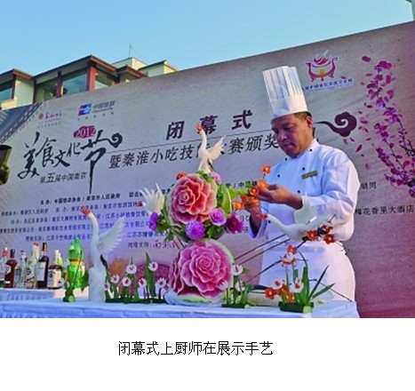 此次美食節(jié)閉幕式,不但集中展示了蟹黃湯包、蜜汁藕、麻團(tuán)、回鹵干等“2012秦淮小吃大賽”的獲獎(jiǎng)作品,還現(xiàn)場舉行了“第五屆中國南京美食文化節(jié)金陵名廚”大賽。10名來自江蘇酒家、真知味、小廚娘、漢府飯店等知名飯店的大廚,現(xiàn)場以“菊花魚”為題,PK廚藝。