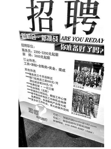 [摘要] 招工方甚至?xí)嘤谇舐毞;而洗車行、餐廳則充分利用起自家的門臉,貼出告示公開招聘相應(yīng)人員,一邊緊巴巴地做生意,一邊眼巴巴等著有人上門來應(yīng)聘,有些餐館甚至為招聘打出境外游獎勵。