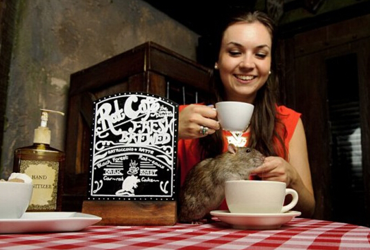 老鼠咖啡屋的靈感源于當(dāng)前日本流行的“貓咖啡屋”,那里的顧客午休時可在貓的陪伴下吃午餐。而倫敦的老鼠咖啡屋中,則是老鼠相陪。如果你胃口夠好,也可在老鼠咖啡屋中就餐。