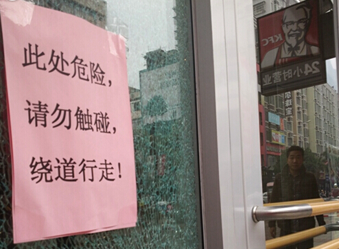 1月7日,記者在肯德基一樓門口看到,一塊鋼化玻璃被擊穿一個窟窿,整塊玻璃全部碎了,卻沒有掉下來。玻璃上貼了一張警示語:“此處危險,請勿觸碰,繞道行走”。據(jù)一名肯德基員工稱,這塊玻璃可能是由于顧客在玩耍時,不小心碰爛的,事情發(fā)生有一個多星期了。已經(jīng)訂了新的玻璃,但是還未到貨。