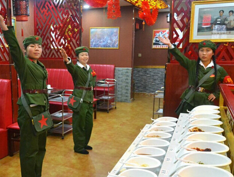 2015年1月10日,在甘肅省平?jīng)鍪幸患倚麻_張的火鍋店,服務(wù)員們?nèi)堪绯伞凹t衛(wèi)兵”的樣子,每當(dāng)有客人走進(jìn)大廳,店門口的迎賓就喊:“老鄉(xiāng)您好!歡迎下鄉(xiāng)改善伙食!痹谶@家以“紅色餐飲”為主題文化的火鍋店,記者還發(fā)現(xiàn),這家火鍋店吸人眼球的不僅僅是服務(wù)員“紅衛(wèi)兵”的打扮,還有許多新鮮的叫法更是讓人好奇,甚至有時(shí)候讓前來消費(fèi)的顧客忍俊不禁。店內(nèi)服務(wù)員管同事叫“社員”,稱包廂為“公社”,稱主管為“隊(duì)長”,他們還把菜譜叫“革命語錄”,把啤酒叫做“地雷”,白酒稱作“炸彈”,餐廳紙是“雞毛信”,代金券是“糧票”。