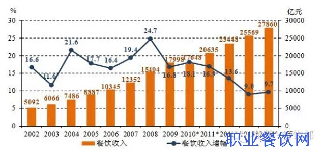 據(jù)國(guó)家統(tǒng)計(jì)局最新發(fā)布的數(shù)據(jù)顯示,2014年全國(guó)餐飲收入27860億元,同比增長(zhǎng)9.7%,比上年加快0.7個(gè)百分點(diǎn),終止了連續(xù)三年增速下滑的頹勢(shì)。中國(guó)烹飪協(xié)會(huì)會(huì)長(zhǎng)姜俊賢表示,按照這一增速,2015年中國(guó)餐飲業(yè)將邁入3萬(wàn)億元新時(shí)代。