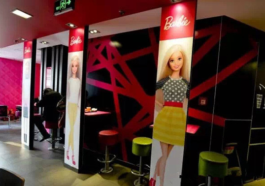 麥當(dāng)勞在北京、廣州、青島、重慶開了多家芭比主題餐廳。店內(nèi)各個角度都設(shè)有高挑靚麗的芭比人形展板,椅背、墻面也被加上芭比元素,還有放滿整個櫥窗的迷你芭比娃娃系列,甚至連店員的服裝也是粉色。