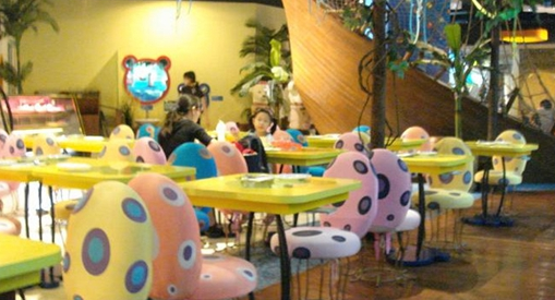 曾經(jīng)紅極一時(shí)的連鎖兒童主題餐廳“芭迪熊”在其第一家店中,讓小朋友吃飯前先進(jìn)行探險(xiǎn)。小朋友們需要登上一條木制“帆船”,開始探險(xiǎn)之旅:在沙灘區(qū)有“椰子樹”和花朵形餐桌;在海洋區(qū),獨(dú)一無二的水母椅子、可愛的大蘑菇飲料站都很吸引小朋友。