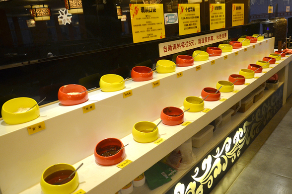 調(diào)料是自助的,品種很多,可以按自己的口味自行調(diào)配,每人5元。