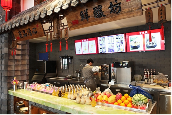 收銀臺叫錢莊,飲料區(qū)叫鮮?坊,蘸料區(qū)有官家賣萌,連員工辦公都在太空艙。