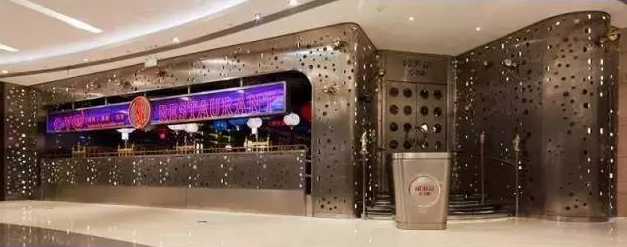 遠處看像盤踞在商場里的金屬洞穴,外圍用不銹鋼緊緊包裹,墻壁上安置了碩大的金銀兩色蜘蛛。在進門處,運用高科技手段,用水幕再現(xiàn)了一個逼真的水簾洞。餐桌上每個蜘蛛都帶上了緊箍咒,這些蜘蛛也成為嘻游記餐廳的標志元素。設(shè)計時沒有刻意去塑造西游記的形象,而是用很多插畫來表達現(xiàn)代想象。翻開菜單就像是翻開一本故事書,菜名都非常有西游記特色,例如“俺老孫最!、“女兒國的春夢”、“松茸洋芋紫金缽”等。