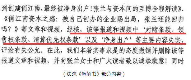 而在昨天,沸沸揚(yáng)揚(yáng)了近兩年的“對(duì)賭協(xié)議”事件出現(xiàn)驚天逆轉(zhuǎn),北京朝陽(yáng)人民法院《調(diào)解書(shū)》顯示,《新財(cái)富》刊發(fā)的《俏江南:資本之殤》等數(shù)篇報(bào)道中對(duì)俏江南的“對(duì)賭條款、領(lǐng)售權(quán)條款、清算優(yōu)先權(quán)條款”以及張?zhí)m“凈身出戶”等主要內(nèi)容失實(shí),并正式向張?zhí)m道歉。