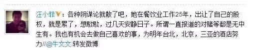 張?zhí)m其子汪小菲曾在微博上轉(zhuǎn)發(fā)《創(chuàng)業(yè)家》雜志對(duì)張?zhí)m的采訪,并說(shuō)“她在餐飲工作25年,就是累了,想歇歇”。然而輿論似乎對(duì)“對(duì)賭協(xié)議”更感興趣,他的言論很快被淹沒(méi),并沒(méi)有人相信他說(shuō)了什么。