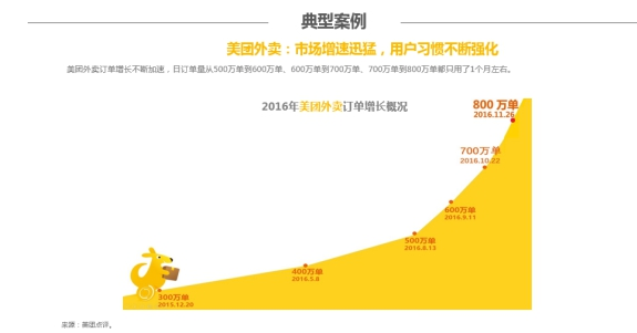 近日,美團點評數(shù)據(jù)研究院發(fā)布《2016中國外賣O2O行業(yè)洞察報告》。報告顯示,在政策鼓勵、消費升級、技術(shù)發(fā)展、用戶習(xí)慣養(yǎng)成等諸多有利因素的助推下,2016年外賣O2O業(yè)務(wù)獲得高速發(fā)展,用戶量持續(xù)增長、發(fā)展空間充裕,僅美團外賣日訂單量就已超過800萬單。