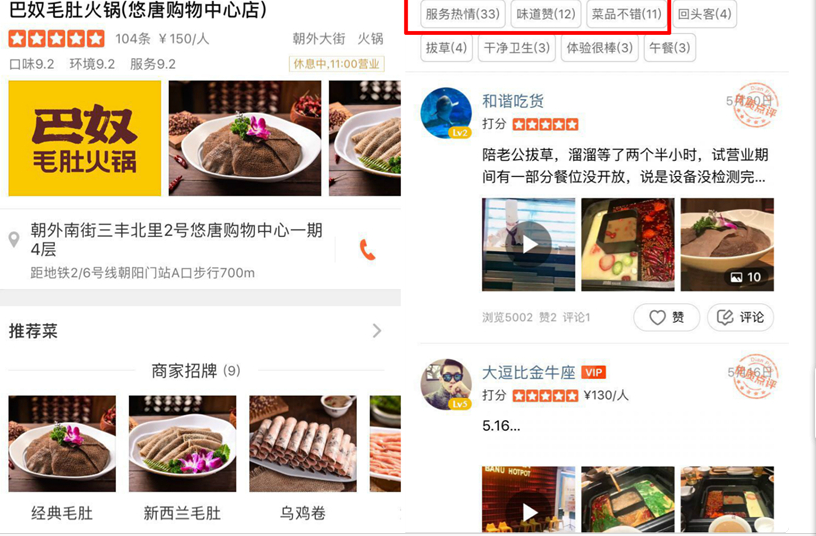一周后,記者再次來到北京店就餐,店內(nèi)餐位已經(jīng)全部開放,仍然供不應(yīng)求。據(jù)巴奴門店負(fù)責(zé)人透露,巴奴北京店定位為毛肚專家旗艦店。試營業(yè)當(dāng)天賣了100多桌,此后幾天的數(shù)據(jù)都有增加。而從顧客的綜合評價來考核,截至發(fā)稿,巴奴北京店在大眾點評上已得到五星好評。97條評價中,好評89條,中評6條,差評2條。好評所夸贊的地方主要在服務(wù)、菜品、店面風(fēng)格、鍋底等方面,其中超過30位顧客點了“服務(wù)好”這個標(biāo)簽,而中評和差評指出的問題在價格偏貴(記者實測,人均消費150左右)、餐位預(yù)定等方面。