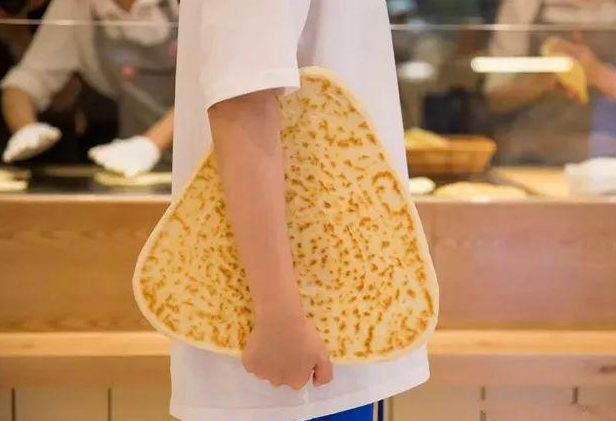盡管店里的常規(guī)款肉夾饃已經(jīng)比外界的大一圈,這里還出了一款巨型肉夾饃,需要5個人才能吃掉1個。這塊饃夾在手里的感覺就像一塊三角形的盾牌。