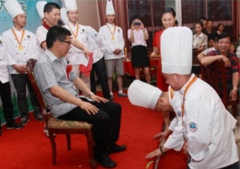 7月10號(hào)晚,“當(dāng)代四大名廚”陳緒榮在湖北黃石陽新舉行了盛大的收徒儀式!收徒儀式由大冶市烹飪餐飲業(yè)協(xié)會(huì)常務(wù)副會(huì)長(zhǎng)兼秘書長(zhǎng)羅文主持,黃石市烹飪餐飲業(yè)協(xié)會(huì)和大冶市烹飪餐飲業(yè)協(xié)會(huì)的眾多嘉賓到場(chǎng)祝賀,北京、江西和武漢等地的弟子專程前來賀喜。首先,我號(hào)召同行承諾推廣綠色食材和綠色烹飪的“生態(tài)宴”,并在“食品安全低碳環(huán)保‘生態(tài)宴’”簽名墻上簽字,大家踴躍寫上自己的名字;隨后,收徒儀式以傳統(tǒng)的拜師形式舉行,按跪拜、敬茶、頒發(fā)證書和合影等程序進(jìn)行;最后,嘉賓和弟子登臺(tái)發(fā)表致辭。