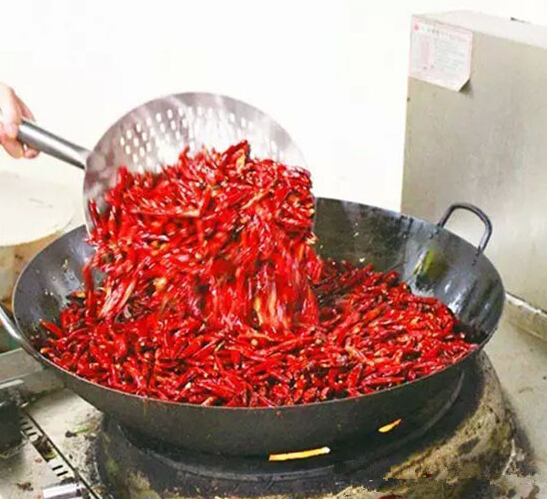 大鐵鍋上火,下大豆油50斤燒至三成熱,調(diào)成中火,陸續(xù)下入泡椒50斤,不停翻炒約半小時,與此同時將整塊的永川豆豉3斤剁成細粒(不要剁碎),至泡椒炒出香后下入剁好的豆豉再炒約15分鐘,下入泡菜丁25斤,繼續(xù)翻炒半小時,一起炒香后停火。