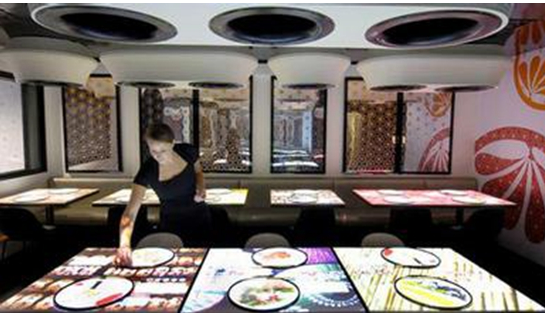 烏克蘭一家公司開(kāi)發(fā)了一種叫做交互式餐廳的技術(shù),客人點(diǎn)餐變得完全自助。餐廳把菜品、飲料的照片、具體信息陳列在一個(gè)防水觸屏桌上,顧客只需要在電子菜單上下單就可以將信息網(wǎng)傳給廚房。不但可以節(jié)約服務(wù)員的本錢(qián),還免掉了詢(xún)問(wèn)菜肴情況的繁瑣程序,在這個(gè)桌面上可以輕松完成點(diǎn)餐的工作。