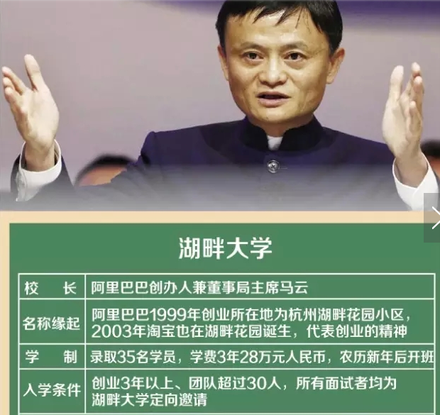 2015年1月26日,馬云和聯(lián)想控股董事長柳傳志、復星集團董事長郭廣昌、萬通控股董事長馮侖、巨人網(wǎng)絡(luò)董事長史玉柱等9名企業(yè)家和學者共同在杭州創(chuàng)建湖畔大學。