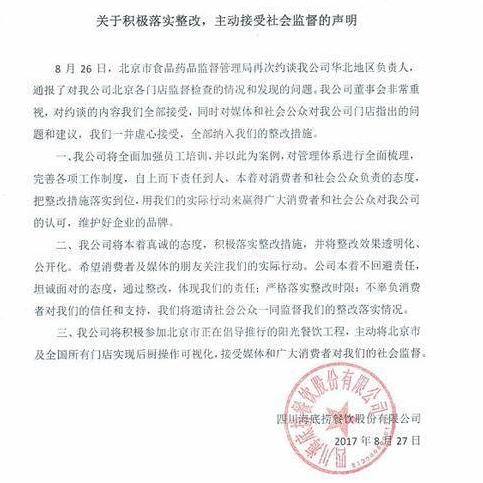 海底撈再發(fā)聲明:鍋我背、錯(cuò)我改、請(qǐng)廣大民眾監(jiān)督